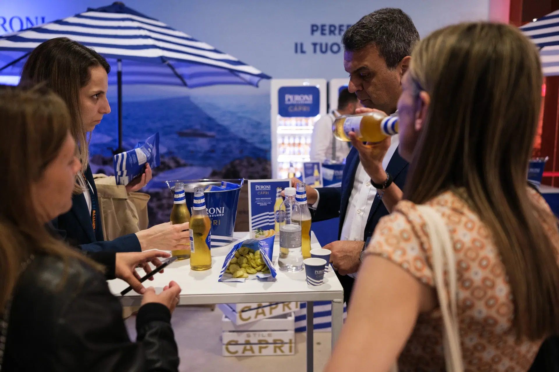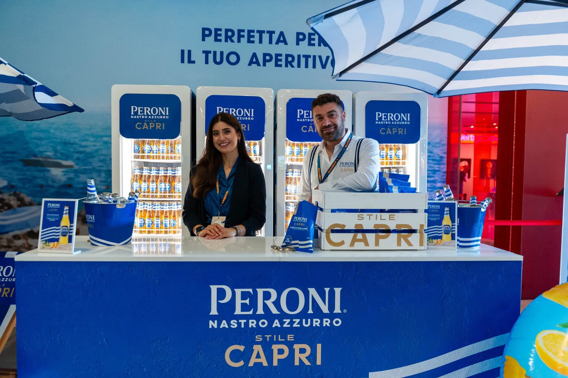 Una delle protagoniste assolute dell’evento è stata la nostra creazione dello stand per Peroni Nastro Azzurro Stile Capri, ispirato al fascino di Capri. Abbiamo progettato un angolo esclusivo che ricreava l’atmosfera di un vero beach bar, con sabbia finissima, ombrelloni e una decorazione che evocava le spiagge del Mediterraneo. Lo stand, che rispecchiava perfettamente l’eleganza e la freschezza del brand, ha attirato l’attenzione di tutti i partecipanti, chei hanno potuto gustare la celebre birra Peroni Nastro Azzurro in un ambiente rilassato e vivace.